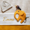 Geboorteknuffel olifant Luka in grijs van 45 cm. Met verwisselbare zooltjes die geborduurd kunnen worden met naam en geboortedatum.