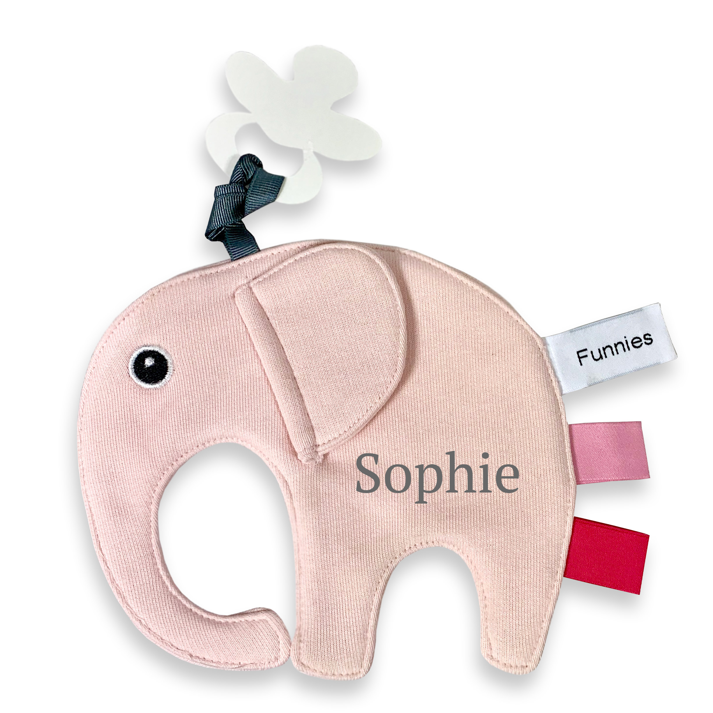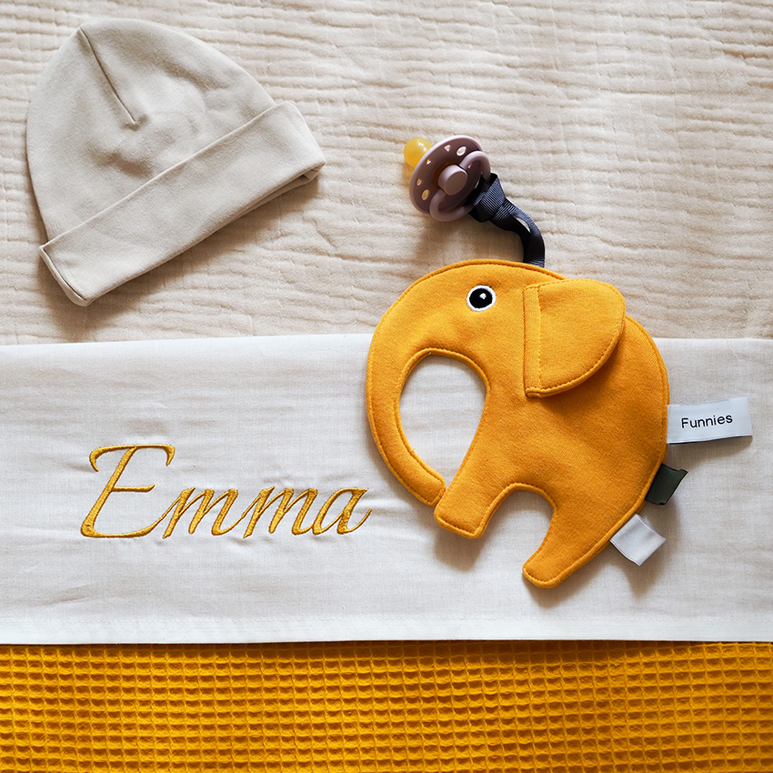 Een zacht olifantje-speendoekje van 100% katoen waar je de naam van je kindje op kunt laten borduren. Praktisch om de speen aan vast te maken en een prachtig persoonlijk kraamcadeau.
