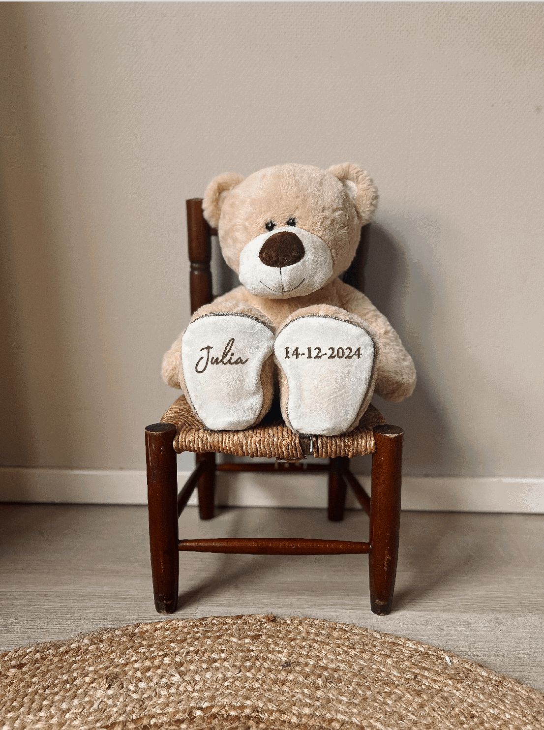 Geboorteknuffel beer met naam | Lichtbruin – 45 cm | Afritsbare zooltjes