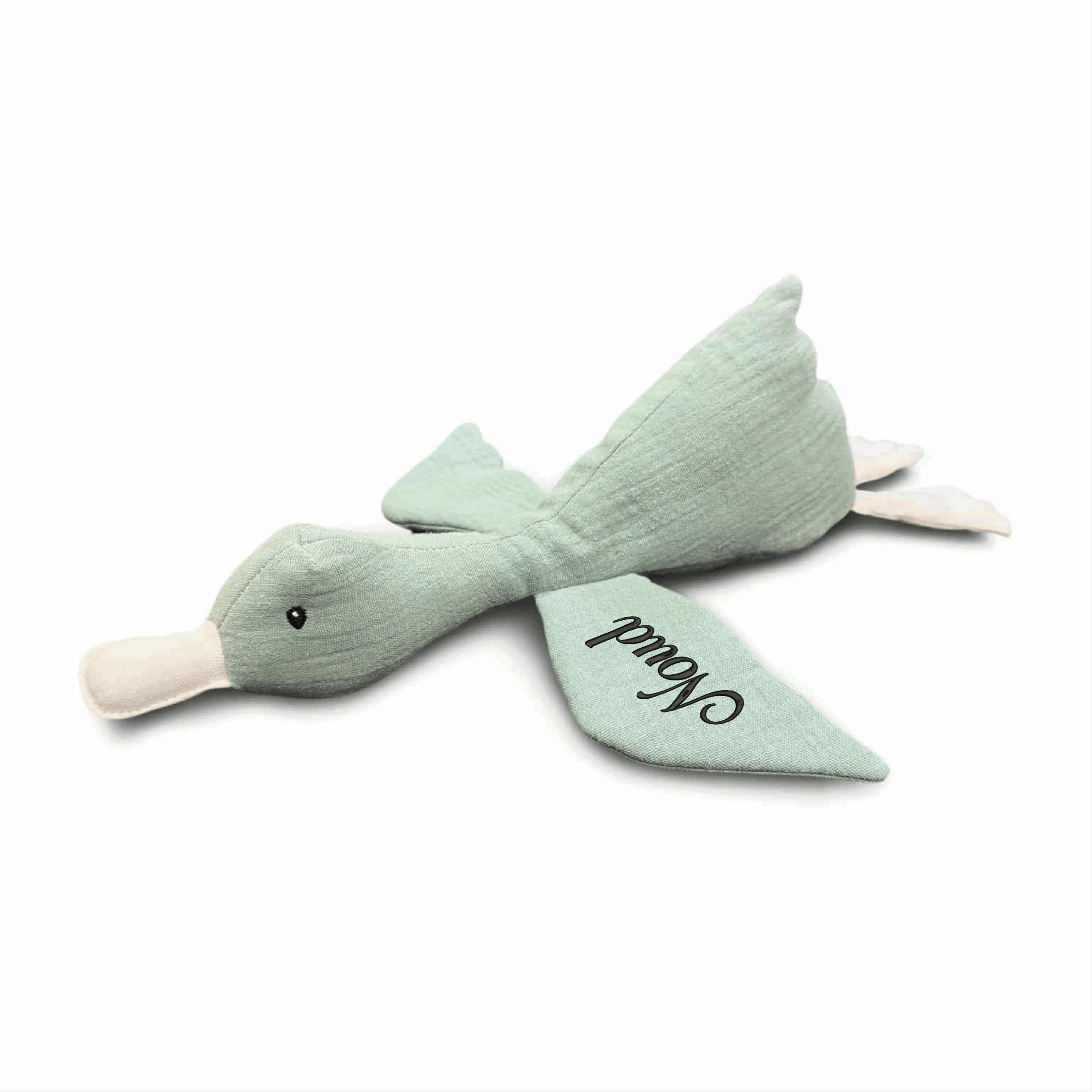 Zacht oudgroene knuffeltje eend van hydrofiel katoen, gepersonaliseerd met naam en eventueel geboortedatum. Perfect als kraamcadeau.